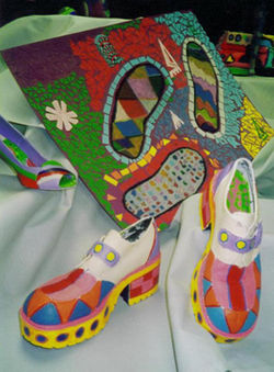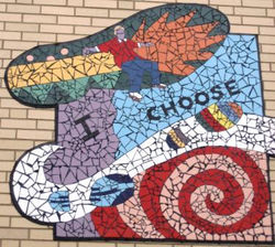 In 2003, the apprentices (many returning from the previous year), designed and fabricated a second mosaic entitled “I choose My Own Path”. This mosaic uses in its design, imagery created by the apprentices in their independent painting projects. Given an actual pair of shoes, each student was asked to paint them with colors and designs that best expressed their personalities. These vibrant and detailed patterns were translated in mosaic and appear in the footprints that clearly connect the two murals as well as the background of the second artwork.